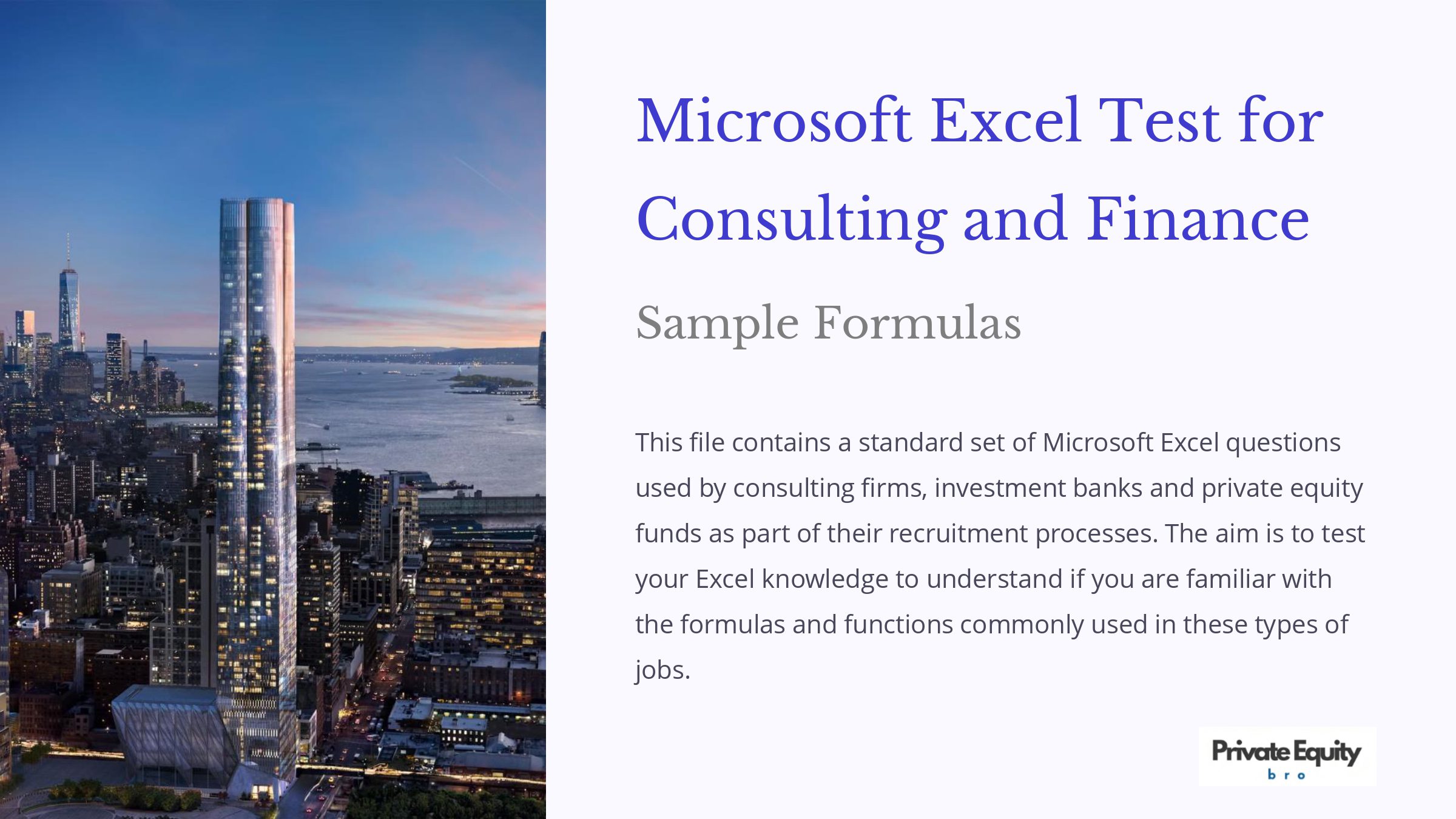 This Excel test is designed for analyst-level candidates preparing for roles in consulting, investment banking, or private equity. It evaluates your familiarity with the key Excel formulas commonly used in these industries.